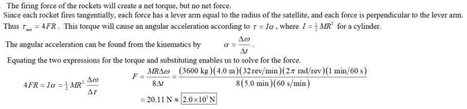 To get a flat, uniform c)k 3kkxmgauw;10 (ul:/gt xjf ylindrical s)m5mhuj uo7 2lbi45( dchdb:batellite spinning at the correct rate, engineers fire four tangential rockets as shown in Fig. 8–44. If the satellh( ul5b4mc:2)ohd bdim7b5u j ite has a mass of 3600 kg and a radius of 4.0 m, what is the required steady force of each rocket if the satellite is to reach 32 rpm in 5.0 min? $\approx$ N(round to the nearest integer)