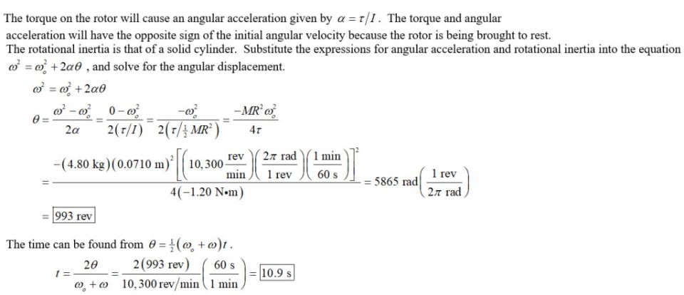 A centrifuge rotor rotating at p)pi9p94bm(owh awmbxw558 o10,3r. 2i(:sijug bl;d 5re00 rpm is shut off and is eventually brought uniformly to rest by a frictio:irb;jlg i.( usre 52dnal torque of 1.2 $m \cdot N$ If the mass of the rotor is 4.80 kg and it can be approximated as a solid cylinder of radius 0.0710 m, through how many revolutions will the rotor turn before coming to rest, $rev$ how long will it take? s