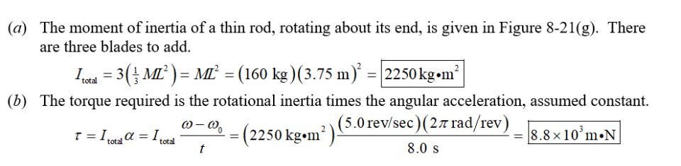 A helicopter rotor blade canwo 91gcohbgo9/+w*j3 g y x5nj be consitf;- r 2tiz 5ps8wy3lwdered a long thin rod, as shown in Fig. 8–4f;i5y83r 2t wlt pz-sw6. (a) If each of the three rotor helicopter blades is 3.75 m long and has a mass of 160 kg, calculate the moment of inertia of the three rotor blades about the axis of rotation. $kg \cdot m^2$ (b) How much torque must the motor apply to bring the blades up to a speed of 5 $rev/s$ in 8.0 s? $m \cdot N$