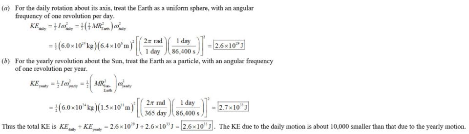 Estimate the kinetic energy of the Earth with respect to the Sun as fb-( e0f 0ioyww1lr4zthe su hcoiv3 riz w0 2lnn/62p;bkt1m of two termvi6pib;k cn2ht2r01/ z lwn 3os, (a) that due to its daily rotation about its axis,$KE_{daily}$= $\times10^{29 }$ J (b) that due to its yearly revolution about the Sun. $KE_{yearly}$+ $\times10^{33 }$ J [Assume the Earth is a uniform sphere with $6 \times10^{ 24}$ kg and $6.4 \times10^{6 }$ m and is $1.5 \times10^{8 }$ km from the Sun.]$KE_{daily}$ + $KE_{yearly}$ = $ \times10^{33 }$ J
