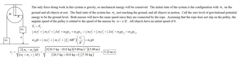 Two masses, $m_1$ = 18 kg and $m_2$ = 26.5 kg are connected by a rope that hangs over a pulley (as in Fig. 8–47). The pulley is a uniform cylinder of radius 0.260 m and mass 7.50 kg. Initially, is on the ground and $m_2$ rests 3.00 m above the ground. If the system is now released, use conservation of energy to determine the speed of $m_2$ just before it strikes the ground. Assume the pulley is frictionless. $m/s$