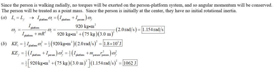 A person of mass 75 kg stands at tzr8 htnx..u jb3.rj*0kd gv/hhe 8 n,hg4sbe3n pcenter of a rotating merry-go-round platform of radius 3.0 ,8ng 4e3hbsnpm and moment of inertia 920 $kg \cdot m^2$ The platform rotates without friction with angular velocity 2 $rad/s$ The person walks radially to the edge of the platform. (a) Calculate the angular velocity when the person reaches the edge. $rad/s$ (b) Calculate the rotational kinetic energy of the system of platform plus person before and after the person’s walk.$KE_i$ = J $KE_f$ = J