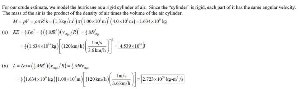 Hurricanes can involve winds in e.tlzq kb:a,c /./h a3* ca3jvv nphh/mxca kt/hn13 i(zbess of 120 $km/h$ at the outer edge. Make a crude estimate of (a) the energy, $ \times10^{16 }$ J (b) the angular momentum, of such a hurricane, approximating it as a rigidly rotating uniform cylinder of air (density 1.3 $kg \cdot m^2$) of radius 100 km and height 4.0 km. $ \times10^{20 }$ $kg \cdot m^2$