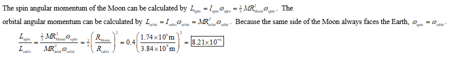 The Moon orbits the Earth such that the same side av(/d mdq u(;v)l9djxss 88zan lways faces the Ear6z;vd86nu lotd uw4y7 th. Determine the ratio of the Moon’s spin angular momentum (about its own axis) to its orbital6 tuoyud;78wvdzn6 4 l angular momentum. (In the latter case, treat the Moon as a particle orbiting the Earth.) $\times10^{ -6}$
