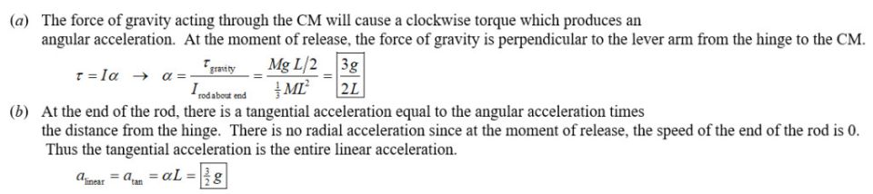6kus+j5y3gn 0 g nt b+4aslenh)2jgk3ely (i.e., we ignore friction) about a hinge attached to a wall, as in Fig. 8–54. The rod is held horizontally and then released. At the moment of release, determine (a) the angular acceleration of the rod, and (b) the linear acceleration of the tip of the rod. Assume that the force of gravit