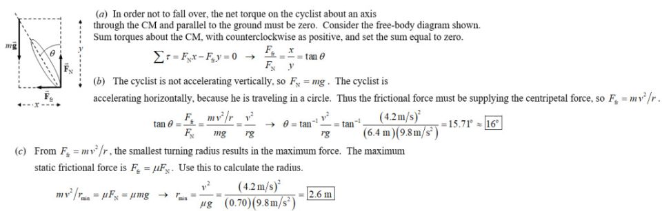 A bicyclist traveling with speed v=4.2m/s on a fla6s0bbvf5ng(h/p/ l n pt road is mtcx.hx 3aczitxx) -;1aking a turn with a radius The forta)c hi31xz c-t;x.x xces acting on the cyclist and cycle are the normal force $\left(\mathbf{\vec{F}}_{\mathrm{N}}\right)$ and friction force $\left(\mathbf{\vec{F}}_{\mathbf{fr}}\right)$ exerted by the road on the tires, and $m\vec{\mathbf{g}}$ the total weight of the cyclist and cycle (see Fig. 8–56). (a) Explain carefully why the angle $\theta$ the bicycle makes with the vertical (Fig. 8–56) must be given by tan $\tan\theta=F_{\mathrm{fr}}/F_{\mathrm{N}}$ if the cyclist is to maintain balance.(round to the nearest integer) (b) Calculate $\theta$ for the values given. $^{\circ} $ (c) If the coefficient of static friction between tires and road is $\mu_s=0.70$ what is the minimum turning radius? m
