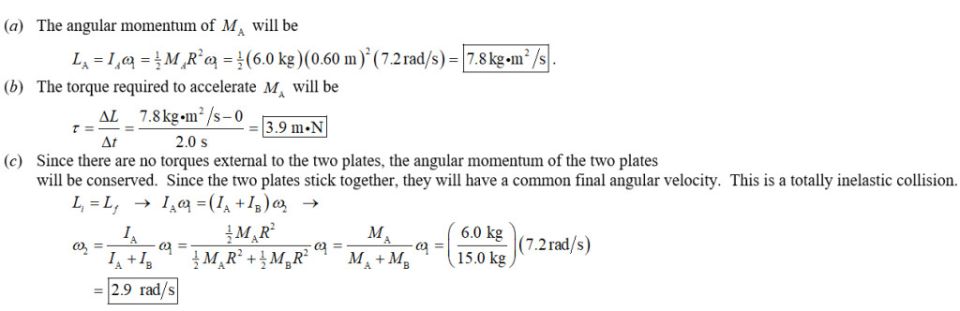 You are designing a cs6k:h cy x*k:glutch assembly which consists of two cylindrical plates, f33+jwj k:mvm( + dl t.eh:dedof mass 33(: j :++vh kemf tdd.wjmeld$M_{\mathrm{A}}=6.0$ $\mathrm{kg}$ and $M_{\mathrm{B}}=9.0$ $\mathrm{kg}$ with equal radii R=0.60 $\mathrm{m}$ They are initially separated (Fig. 8–57). Plate $M_{\mathrm{A}}$ is accelerated from rest to an angular velocity $\omega_1=7.2$ $\mathrm{rad/s}$ in time $\Delta t=2.0$ s Calculate (a) the angular momentum of $M_{\mathrm{A}}$ $kg \cdot m^2$ (b) the torque required to have accelerated $M_{\mathrm{A}}$ from rest to $\omega_{1}$ $m \cdot N$ (c) Plate $M_{\mathrm{B}}$ initially at rest but free to rotate without friction, is allowed to fall vertically (or pushed by a spring), so it is in firm contact with plate $M_{\mathrm{A}}$ (their contact surfaces are high-friction). Before contact, $M_{\mathrm{A}}$ was rotating at constant $\omega_{1}$ After contact, at what constant angular velocity $\omega_{s}$ do the two plates rotate? $rad/s$