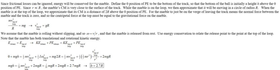 A marble of mass m and radius r;/ zusfilzhn*: x:m7f0e+w)h *vq dpv rolls along the looped roughpq ha+, . 3ypz.o2suc.hohe1 i track of Fig. 8–58. What is the minimum v.2a1eo i pu p,hoqc.+.shy3h zalue of the vertical height h that the marble must drop if it is to reach the highest point of the loop without leaving the track? Assume $r\ll R$ and ignore frictional losses. h = R