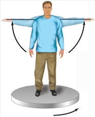 A person stands, hands at his side, on a t ,* 5ruhqzsf(zs1di6platform that is rotating at a rate of 1.3rev/s If he raises his arms to a horizontal position, Fig. 8–48, the speed of zh6rssf dq(,zu5ti1* rotation decreases to 0.8 $rev/s$ (a) Why?