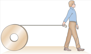 A large spool of rope rolls on the g3ot ntm/ m0*bma8 h+jfround with the end of the rope lying on the top edge of the spool. A person grabs the end of the rope and walks a distance L, holding onto it, Fig. 8–50. The spool rolls behind the person without slipping. What len/n*ao f3+bjt0m 8mmhtgth of rope unwinds from the spool? How far does the spool’s center of mass move?