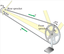 (a) For a bicycle, how is the angular speed ) stss0.9i*2x u7mxq ab-ky reof the rear wheel ($\omega_R$) related to that of the pedals and front sprocket ($\omega_F$) Fig. 8–52? That is, derive a formula for ($\omega_R$)/($\omega_F$) Let $N_F$ and $N_R$ be the number of teeth on the front and rear sprockets, respectively. The teeth are spaced equally on all sprockets so that the chain meshes properly.