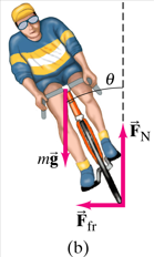 (a) Explain carefully why the angle $\theta$ the bicycle makes with the vertical (Fig. 8–56) must be given by tan $\tan\theta=F_{\mathrm{fr}}/F_{\mathrm{N}}$ if the cyclist is to maintain balance.(round to the nearest integer)