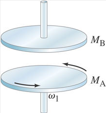 (c) Plate $M_{\mathrm{B}}$ initially at rest but free to rotate without friction, is allowed to fall vertically (or pushed by a spring), so it is in firm contact with plate $M_{\mathrm{A}}$ (their contact surfaces are high-friction). Before contact, $M_{\mathrm{A}}$ was rotating at constant $\omega_{1}$ After contact, at what constant angular velocity $\omega_{s}$ do the two plates rotate?    $rad/s$