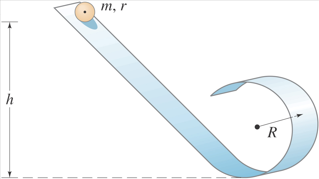 A marble of mass m and radius r rolls along the loope(l-taee+r8no w;tu*abo al-1d rough track of Fig. 8–58. What is the minimum value of the vertical height h that the er1o*-wbtl-al;u8ao+tan e ( marble must drop if it is to reach the highest point of the loop without leaving the track? Assume $r\ll R$ and ignore frictional losses. h =    R
